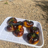 Story: This beautiful small beefsteak style tomato grew well for us outdoors in 2025 with minimal blight or issues with a beautiful balanced, slightly sweet flavor. An indeterminate type, the fruits have a strong contrast from deep purple to bright orange with vertical striping making them striking in both the garden and kitchen.